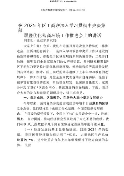【七哥公文】2025年:【七哥公文】在2025年区工商联深入学习贯彻中央决策部署暨优化营商环境工作推进会上的讲话+更多免费公文+VX:QiGeGongWen2024+更多免费公文+VX:QiGeGongWen2024