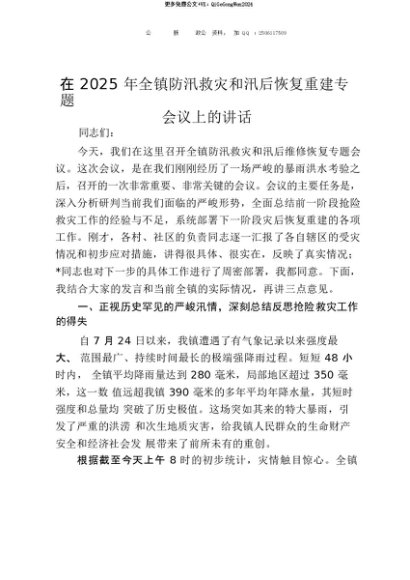 【七哥公文】2025年:【七哥公文】在2025年全镇防汛救灾和汛后恢复重建专题会议上的讲话+更多免费公文+VX:QiGeGongWen2024+更多免费公文+VX:QiGeGongWen2024