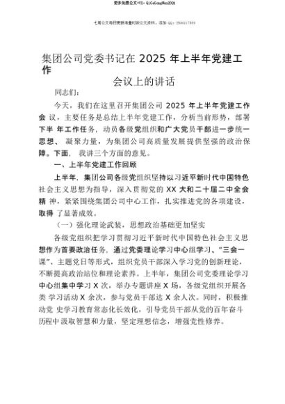 【七哥公文】2025年:【七哥公文】集团公司党委书记在2025年上半年党建工作会议上的讲话+更多免费公文+VX:QiGeGongWen2024+更多免费公文+VX:QiGeGongWen2024