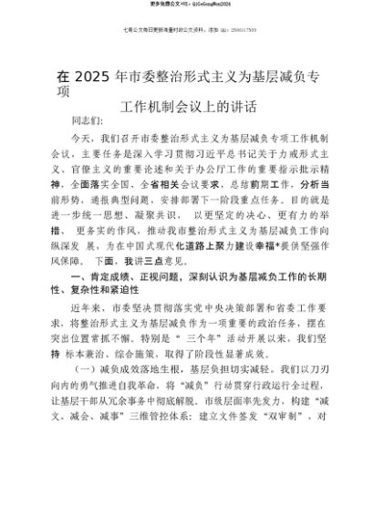 【七哥公文】2025年:【七哥公文】在2025年市委整治形式主义为基层减负专项工作机制会议上的讲话+更多免费公文+VX:QiGeGongWen2024+更多免费公文+VX:QiGeGongWen2024