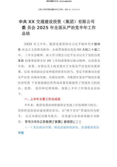 【七哥公文】2025年:【七哥公文】中共XX交通建设投资(集团)有限公司委员会2025年全面从严治党半年工作总结+更多免费公文+VX:QiGeGongWen2024+更多免费公文+VX:QiGeGongWen2024