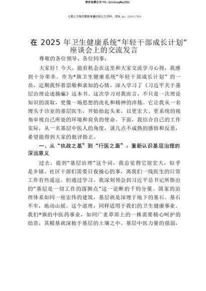 【七哥公文】2025年:【七哥公文】在2025年卫生健康系统“年轻干部成长计划”座谈会上的交流发言+更多免费公文+VX:QiGeGongWen2024+更多免费公文+VX:QiGeGongWen2024