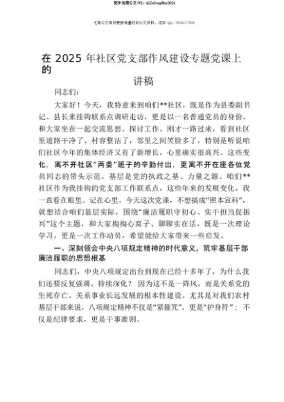 【七哥公文】2025年:【七哥公文】在2025年社区党支部作风建设专题党课上的讲稿+更多免费公文+VX:QiGeGongWen2024+更多免费公文+VX:QiGeGongWen2024