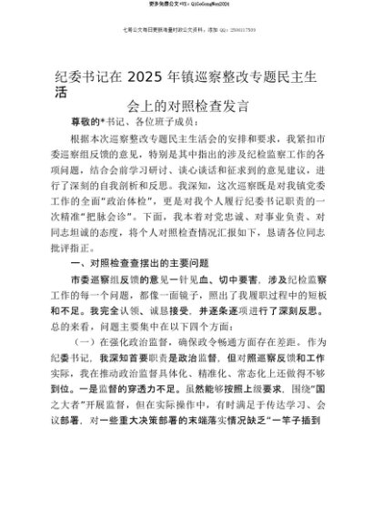 【七哥公文】2025年:【七哥公文】纪委书记在2025年镇巡察整改专题民主生活会上的对照检查发言+更多免费公文+VX:QiGeGongWen2024+更多免费公文+VX:QiGeGongWen2024