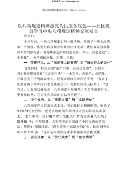 【七哥公文】2025年:【七哥公文】以八项规定精神擦亮为民服务底色——社区党员学习中央八项规定精神交流发言+更多免费公文+VX:QiGeGongWen2024+更多免费公文+VX:QiGeGongWen2024