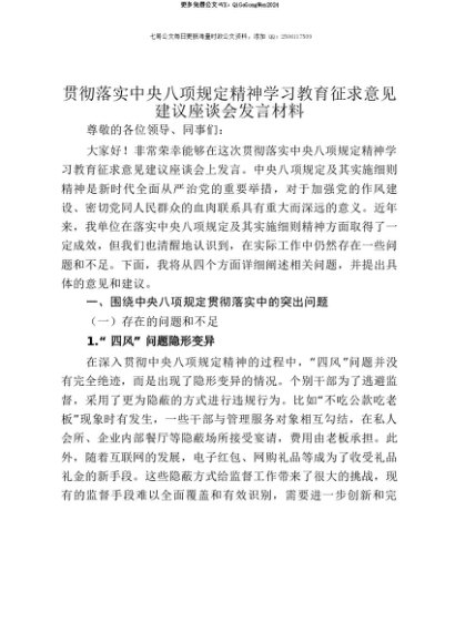 【七哥公文】2025年:【七哥公文】贯彻落实中央八项规定精神学习教育征求意见建议座谈会发言材料+更多免费公文+VX:QiGeGongWen2024+更多免费公文+VX:QiGeGongWen2024