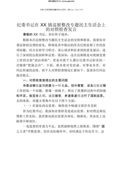 【七哥公文】2025年:【七哥公文】纪委书记在XX镇巡察整改专题民主生活会上的对照检查发言+更多免费公文+VX:QiGeGongWen2024+更多免费公文+VX:QiGeGongWen2024