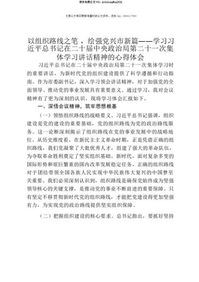 【七哥公文】2025年:【七哥公文】以组织路线之笔,绘强党兴市新篇——学习习近平总书记在二十届中央政治局第二十一次集体学习讲话精神的心得体会+更多免费公文+VX:QiGeGongWen2024+更多免费公文+VX:QiGeGongWen2024