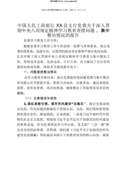 【七哥公文】2025年:【七哥公文】中国人民工商银行XX县支行党委关于深入贯彻中央八项规定精神学习教育查摆问题、集中整治情况的报告+更多免费公文+VX:QiGeGongWen2024+更多免费公文+VX:QiGeGongWen2024