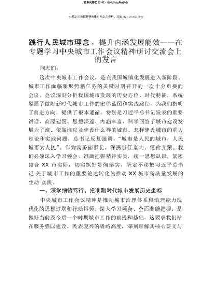【七哥公文】2025年:【七哥公文】践行人民城市理念,提升内涵发展能效——在专题学习中央城市工作会议精神研讨交流会上的发言+更多免费公文+VX:QiGeGongWen2024+更多免费公文+VX:QiGeGongWen2024