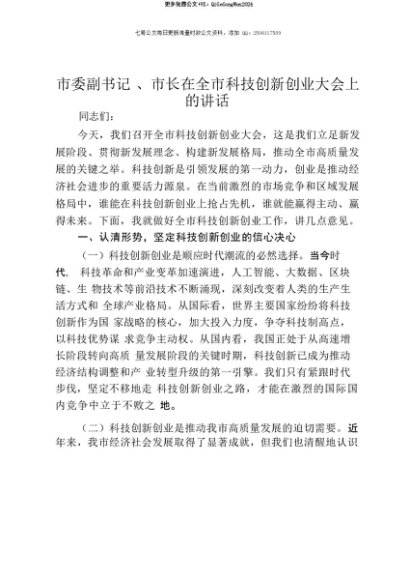 【七哥公文】2025年:【七哥公文】市委副书记、市长在全市科技创新创业大会上的讲话+更多免费公文+VX:QiGeGongWen2024+更多免费公文+VX:QiGeGongWen2024