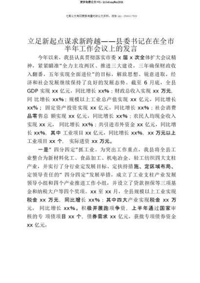 【七哥公文】2025年:【七哥公文】立足新起点谋求新跨越——县委书记在在全市半年工作会议上的发言+更多免费公文+VX:QiGeGongWen2024+更多免费公文+VX:QiGeGongWen2024