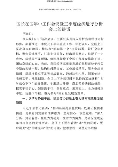 【七哥公文】2025年:【七哥公文】区长在区年中工作会议暨三季度经济运行分析会上的讲话+更多免费公文+VX:QiGeGongWen2024+更多免费公文+VX:QiGeGongWen2024