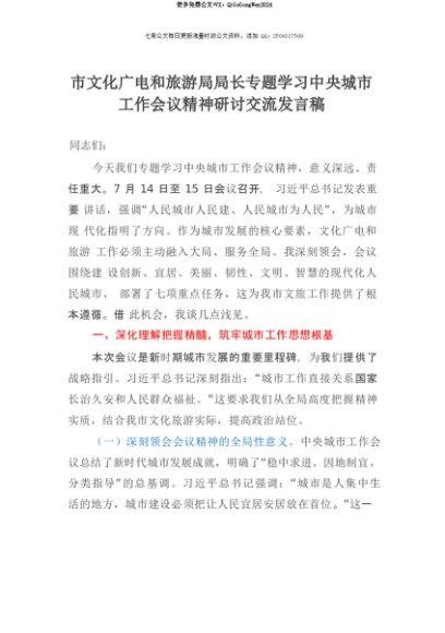 【七哥公文】2025年:【七哥公文】市文化广电和旅游局局长专题学习中央城市工作会议精神研讨交流发言稿+更多免费公文+VX:QiGeGongWen2024+更多免费公文+VX:QiGeGongWen2024