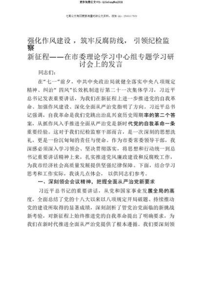 【七哥公文】2025年:【七哥公文】强化作风建设,筑牢反腐防线,引领纪检监察新征程——在市委理论学习中心组专题学习研讨会上的发言+更多免费公文+VX:QiGeGongWen2024+更多免费公文+VX:QiGeGongWen2024