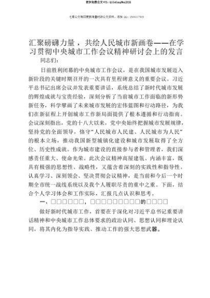 【七哥公文】2025年:【七哥公文】汇聚磅礴力量,共绘人民城市新画卷——在学习贯彻中央城市工作会议精神研讨会上的发言+更多免费公文+VX:QiGeGongWen2024+更多免费公文+VX:QiGeGongWen2024