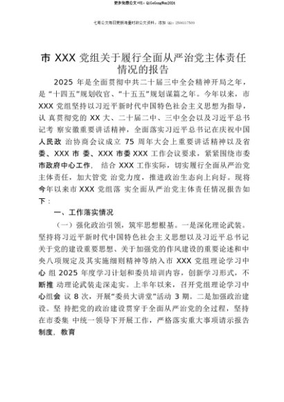 【七哥公文】2025年:【七哥公文】市XXX党组关于履行全面从严治党主体责任情况的报告+更多免费公文+VX:QiGeGongWen2024+更多免费公文+VX:QiGeGongWen2024
