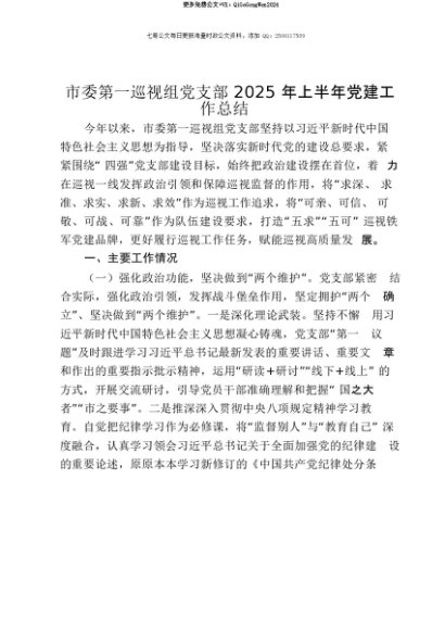 【七哥公文】2025年:【七哥公文】市委第一巡视组党支部2025年上半年党建工作总结+更多免费公文+VX:QiGeGongWen2024+更多免费公文+VX:QiGeGongWen2024