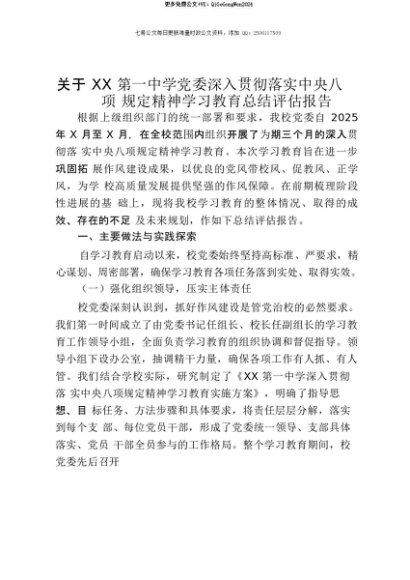 【七哥公文】2025年:【七哥公文】关于XX第一中学党委深入贯彻落实中央八项规定精神学习教育总结评估报告+更多免费公文+VX:QiGeGongWen2024+更多免费公文+VX:QiGeGongWen2024
