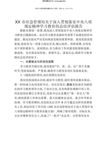 【七哥公文】2025年:【七哥公文】XX市应急管理局关于深入贯彻落实中央八项规定精神学习教育的总结评估报告+更多免费公文+VX:QiGeGongWen2024+更多免费公文+VX:QiGeGongWen2024