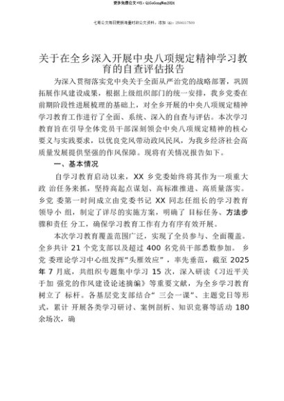 【七哥公文】2025年:【七哥公文】关于在全乡深入开展中央八项规定精神学习教育的自查评估报告+更多免费公文+VX:QiGeGongWen2024+更多免费公文+VX:QiGeGongWen2024