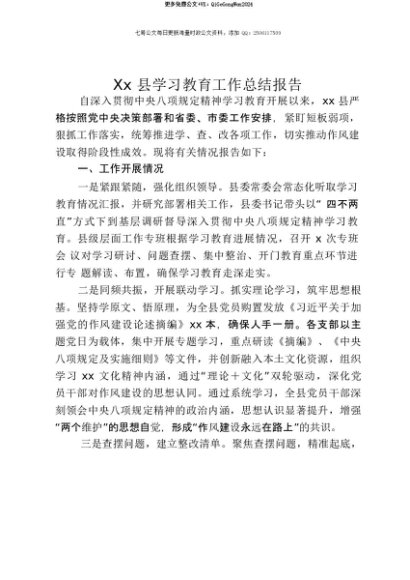 【七哥公文】2025年:【七哥公文】Xx县贯彻中央八项规定精神学习教育工作总结报告+更多免费公文+VX:QiGeGongWen2024+更多免费公文+VX:QiGeGongWen2024
