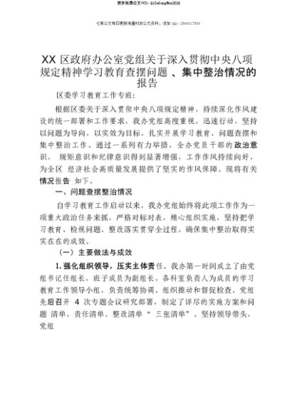 【七哥公文】2025年:【七哥公文】XX区政府办公室党组关于深入贯彻中央八项规定精神学习教育查摆问题、集中整治情况的报告+更多免费公文+VX:QiGeGongWen2024+更多免费公文+VX:QiGeGongWen2024