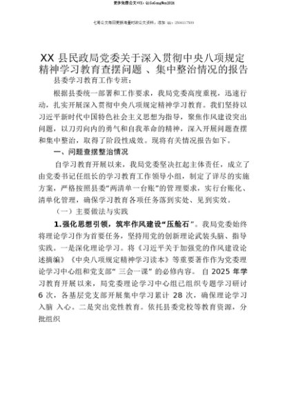 【七哥公文】2025年:【七哥公文】XX县民政局党委关于深入贯彻中央八项规定精神学习教育查摆问题、集中整治情况的报告+更多免费公文+VX:QiGeGongWen2024+更多免费公文+VX:QiGeGongWen2024