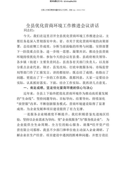 【七哥公文】2025年:【七哥公文】全县优化营商环境工作推进会议讲话+更多免费公文+VX:QiGeGongWen2024+更多免费公文+VX:QiGeGongWen2024