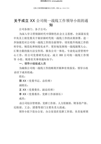 【七哥公文】2025年:【七哥公文】关于成立XX公司统一战线工作领导小组的通知+更多免费公文+VX:QiGeGongWen2024+更多免费公文+VX:QiGeGongWen2024