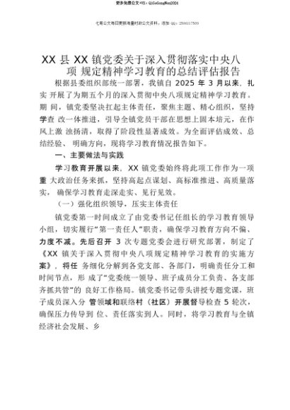 【七哥公文】2025年:【七哥公文】XX县XX镇党委关于深入贯彻落实中央八项规定精神学习教育的总结评估报告+更多免费公文+VX:QiGeGongWen2024+更多免费公文+VX:QiGeGongWen2024