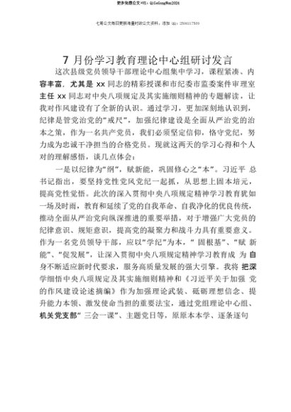 【七哥公文】2025年:【七哥公文】7月份贯彻中央八项规定精神学习教育理论中心组研讨发言+更多免费公文+VX:QiGeGongWen2024+更多免费公文+VX:QiGeGongWen2024