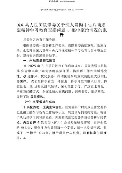 【七哥公文】2025年:【七哥公文】XX县人民医院党委关于深入贯彻中央八项规定精神学习教育查摆问题、集中整治情况的报告+更多免费公文+VX:QiGeGongWen2024+更多免费公文+VX:QiGeGongWen2024