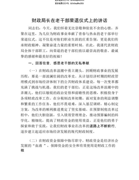 【七哥公文】2025年:【七哥公文】财政局长在老干部荣退仪式上的讲话+更多免费公文+VX:QiGeGongWen2024+更多免费公文+VX:QiGeGongWen2024