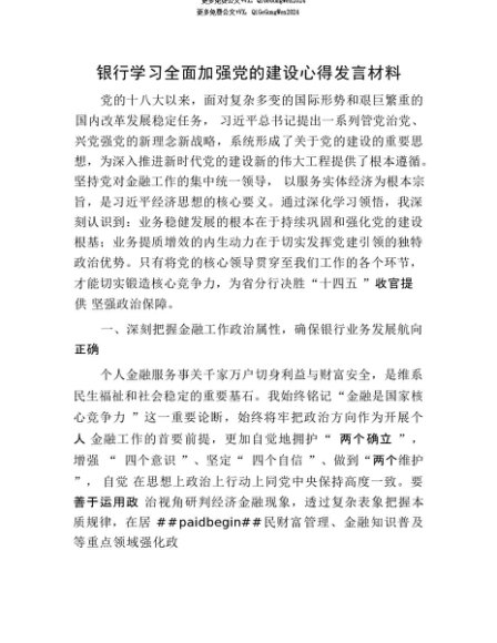 【七哥公文】2025年:【七哥公文】银行学习全面加强X的建设心得发言材料+更多免费公文+VX:QiGeGongWen2024+更多免费公文+VX:QiGeGongWen2024
