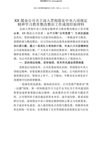 【七哥公文】2025年:【七哥公文】XX煤业公司关于深入贯彻落实中央八项规定精神学习教育整改整治工作成效经验材料+更多免费公文+VX:QiGeGongWen2024+更多免费公文+VX:QiGeGongWen2024