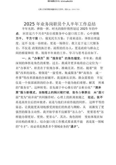 【七哥公文】2025年:【七哥公文】2025年业务岗职员个人半年工作总结+更多免费公文+VX:QiGeGongWen2024+更多免费公文+VX:QiGeGongWen2024