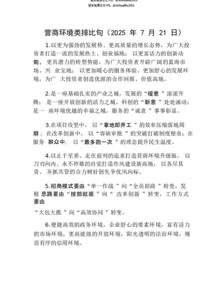 【七哥公文】2025年:【七哥公文】营商环境类排比句(2025年7月21日)+更多免费公文+VX:QiGeGongWen2024+更多免费公文+VX:QiGeGongWen2024