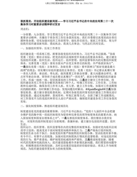 【七哥公文】2025年:【七哥公文】狠抓落实,开创组织建设新局面——学习习近平总书记在中央ZZ局第二十一次集体学习时重要讲话精神研讨发言+更多免费公文+VX:QiGeGongWen2024+更多免费公文+VX:QiGeGongWen2024