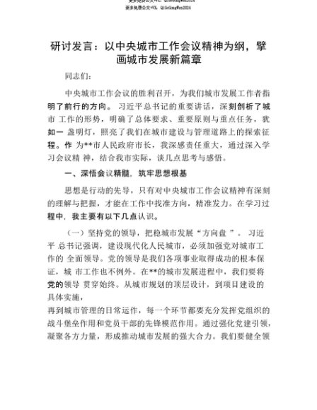 【七哥公文】2025年:【七哥公文】研讨发言:以中央城市工作会议精神为纲,擘画城市发展新篇章+更多免费公文+VX:QiGeGongWen2024+更多免费公文+VX:QiGeGongWen2024