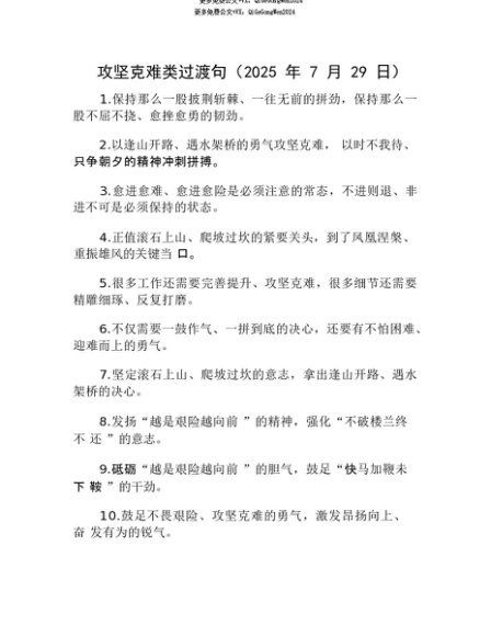 【七哥公文】2025年:【七哥公文】攻坚克难类过渡句(2025年7月29日)+更多免费公文+VX:QiGeGongWen2024+更多免费公文+VX:QiGeGongWen2024