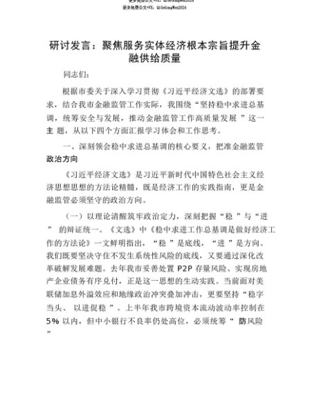 【七哥公文】2025年:【七哥公文】研讨发言:聚焦服务实体经济根本宗旨 提升金融供给质量+更多免费公文+VX:QiGeGongWen2024+更多免费公文+VX:QiGeGongWen2024