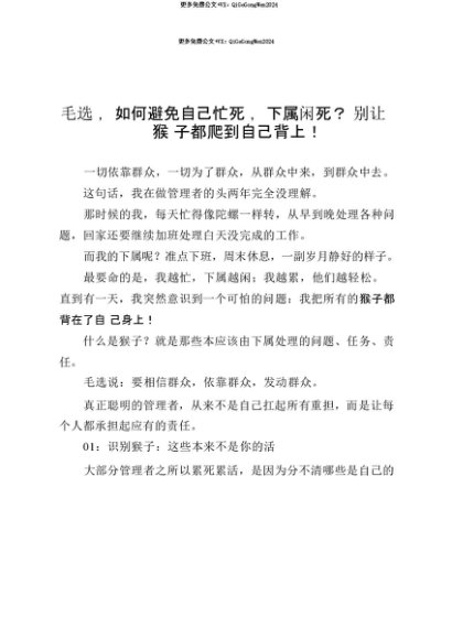 【七哥公文】2025年:【七哥公文】毛选,如何避免自己忙死,下属闲死?别让猴子都爬到自己背上+更多免费公文+VX:QiGeGongWen2024+更多免费公文+VX:QiGeGongWen2024