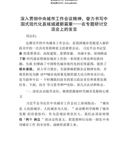 【七哥公文】2025年:【七哥公文】深入贯彻中央城市工作会议精神,奋力书写中国式现代化县域城建新篇章——在专题研讨交流会上的发言+更多免费公文+VX:QiGeGongWen2024+更多免费公文+VX:QiGeGongWen2024