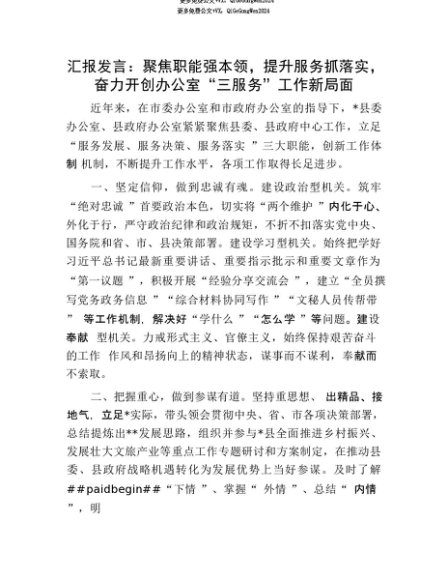 【七哥公文】2025年:【七哥公文】汇报发言:聚焦职能强本领,提升服务抓落实,奋力开创办公室“三服务”工作新局面+更多免费公文+VX:QiGeGongWen2024+更多免费公文+VX:QiGeGongWen2024