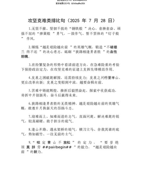 【七哥公文】2025年:【七哥公文】攻坚克难类排比句(2025年7月28日)+更多免费公文+VX:QiGeGongWen2024+更多免费公文+VX:QiGeGongWen2024