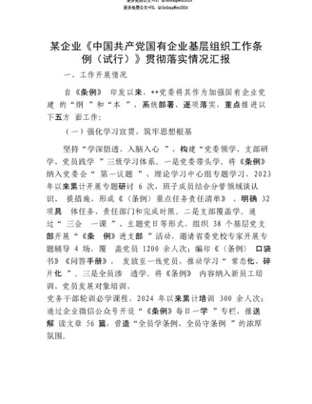 【七哥公文】2025年:【七哥公文】某企业《中国共产X国有企业基层组织工作条例(试行)》贯彻落实情况汇报+更多免费公文+VX:QiGeGongWen2024+更多免费公文+VX:QiGeGongWen2024