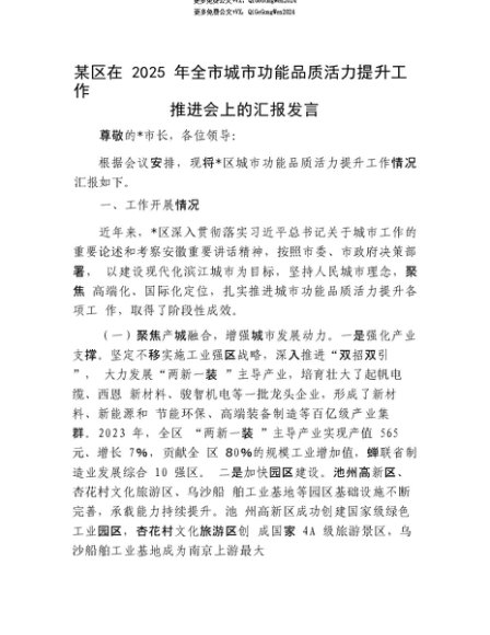 【七哥公文】2025年:【七哥公文】某区在2025年全市城市功能品质活力提升工作推进会上的汇报发言+更多免费公文+VX:QiGeGongWen2024+更多免费公文+VX:QiGeGongWen2024