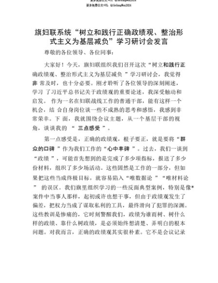 【七哥公文】2025年:【七哥公文】旗妇联系统“树立和践行正确政绩观、整治形式主义为基层减负”学习研讨会发言+更多免费公文+VX:QiGeGongWen2024+更多免费公文+VX:QiGeGongWen2024