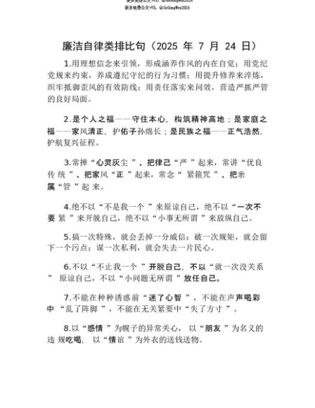 【七哥公文】2025年:【七哥公文】廉洁自律类排比句(2025年7月24日)+更多免费公文+VX:QiGeGongWen2024+更多免费公文+VX:QiGeGongWen2024